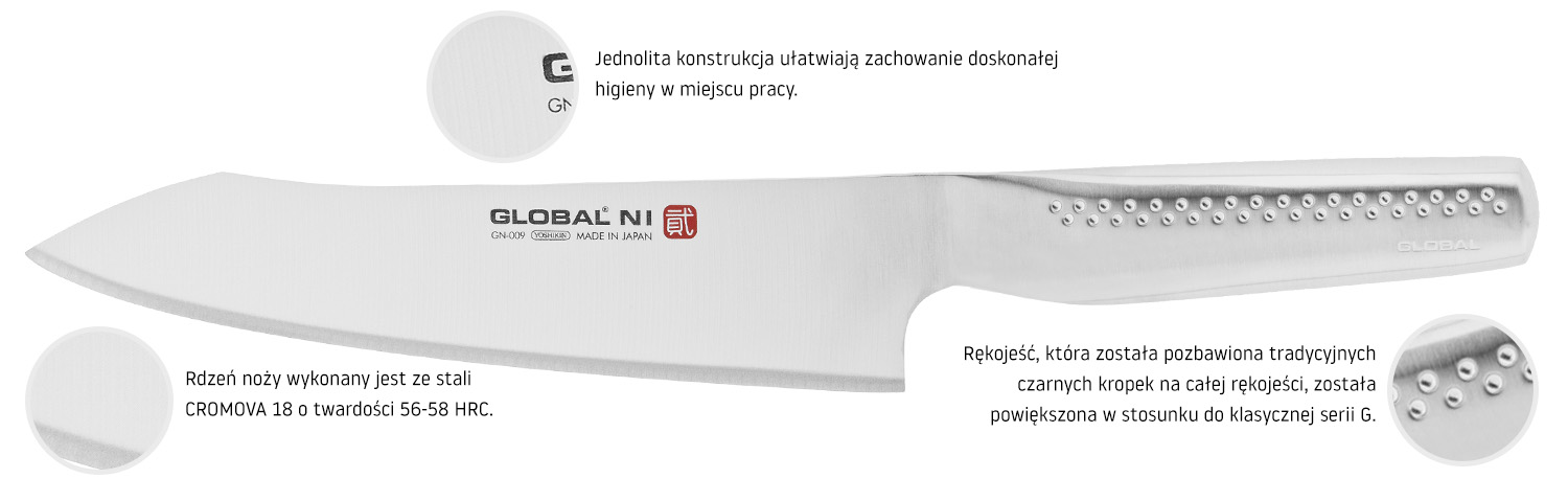 "NI" w języku japońskim oznacza liczbę 2. Stąd też, z właściwą dla Japonii prostotą, wzięła się nazwa serii noży marki Global. Po odniesieniu sukcesu na rynku noży japońskich dzięki serii G i najsłynniejszemu modelowi – G2 – Komin Yamada zaprojektował kolejne modele, o bardziej orientalnym kształcie. Global NI to kształty w dużej mierze inspirowane nożami które w tradycyjnej kuchni japońskiej nazywałyby się bunka i kiritsuke – bardzo wszechstronne i użyteczne noże o charakterystycznie załamanym czubku. Charakterystyczne cechy tej marki, czyli wykonanie noża w całości z metalu, zastosowanie nierdzewnej stali Cromova18 oraz kropki na rękojeści (chociaż bez czarnego wypełnienia) znalazły się także w tej serii.