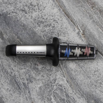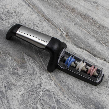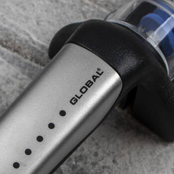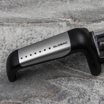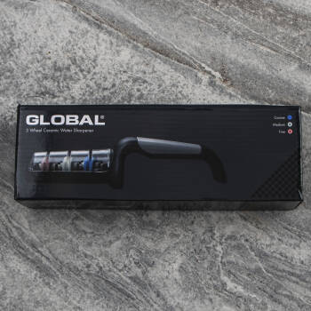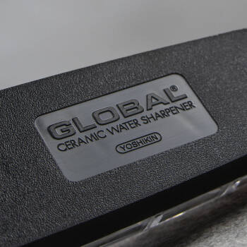 Trzyfazowa ostrzałka ceramiczna, zaprojektowana specjalnie dla noży Global i przeznaczona do ostrzenia wszystkich rodzajów noży, z wyjątkiem tych o szlifach jednostronnych, np. tradycyjnych noży japońskich. Dzięki wodzie proces ostrzenia przebiega szybciej, a fabrycznie ustawione otwory ułatwiają naostrzenie noża pod odpowiednim kątem. Gumowany uchwyt i podstawa mają właściwości przeciwpoślizgowe.