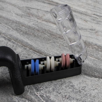 1. Nalać wody do komory z kołami i nie wylewać jej do końca ostrzenia. Woda nawilża ceramiczne ostrzałki i zapobiega przegrzaniu ostrza.