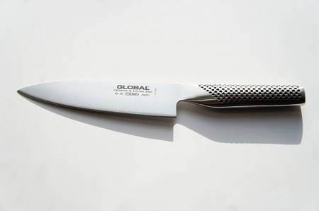Nóż szefa kuchni Global G-58 o długości 16 cm to niezbędnik każdej kuchni, sprawdzi się niemal przy wszystkich pracach kuchennych.Średniej wielkości, wszechstronny nóż, którego główny zastosowanie jest krojenia mięsa, również doskonale sprawdzi się jako uniwersalne narzędzie, którym swobodnie posiekamy zioła lub pokroimy warzywa w kostkę czy w plastry. Ostrze doskonale wyprofilowane pozwala błyskawicznie i schludnie pokroić większe produkty, nie uszkadzając przy tym delikatnych składników. Doskonałym uzupełnieniem dla noża szefa kuchni jest nóż do pieczywa oraz mniejszy nóż uniwersalny.