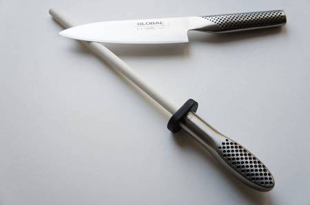 Ceramiczny musak 22 cm Global G-74 doskonale sprawdza się w regularnym podtrzymywaniu ostrości noży, 2-3 przeciągnięcia pozwolą wyrównać krawędź tnącą.