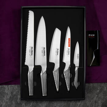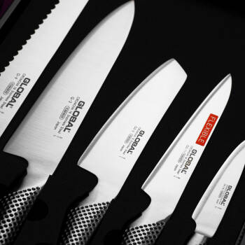 Praktyczny zestaw noży Global stanowi znakomity fundament indywidualnej kolekcji kuchennej. Blok w kształcie żaglowca wykonano ze stali nierdzewnej, zdobionej charakterystycznymi kropkami. Jego czarna podstawa ma właściwości antypoślizgowe. Blok posiada 10 otworów różnej wielkości, na 9 noży oraz pręt ostrzący lub nożyczki, co pozwala stworzyć komplet wedle własnego uznania. Podstawę można zdjąć, żeby dokładnie wyczyścić otwory i zapobiec odkładaniu się resztek pożywienia.